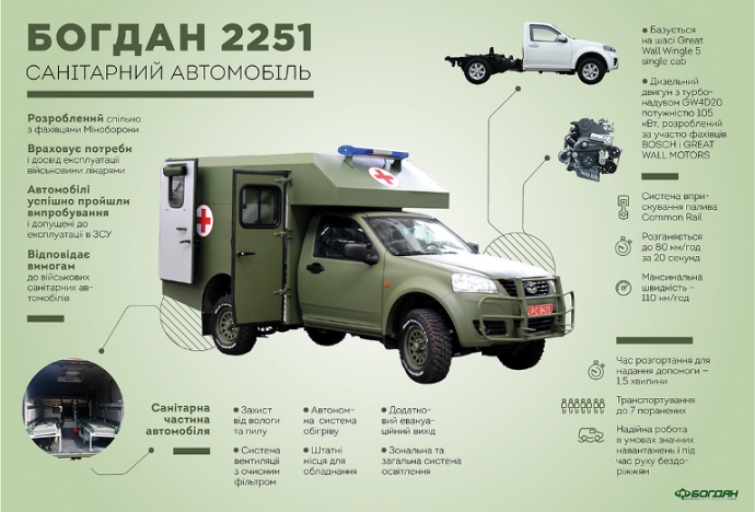 «Украинская армия получит модернизированные автомобили „Богдан 2251“. В 2018 году они получили ряд изменений, которые согласовывались с военными медиками и представителями Министерства обороны. Теперь модернизированные „Богдан 2251“ постепенно заменяют устаревшие советские УАЗы, получая положительные отзывы от представителей ВСУ», — говорят у производителя.
