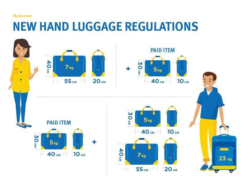 Согласно новым правилам, пассажиры с билетами, в стоимость которых не входит перевозка зарегистрированного багажа, смогут взять с собой на борт самолета 1 место ручной клади весом до 7 кг и размерами не более чем 55×40×20 см, а также верхнюю одежду и зонтик.