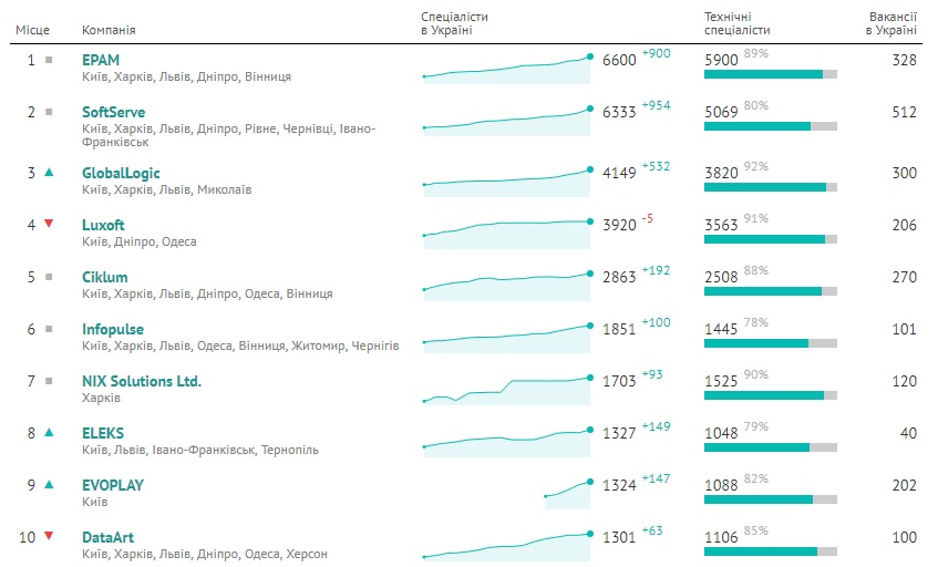 43 компании из топ-50 имеют офисы в Киеве. Во Львове и Харькове офисы есть только у 21 и 20 компаний соответственно. Крупнейшей компанией Киева является EPAM (более 2800 специалистов), Харькова - NIX Solutions (1700), Львова - SoftServe (более 3000).