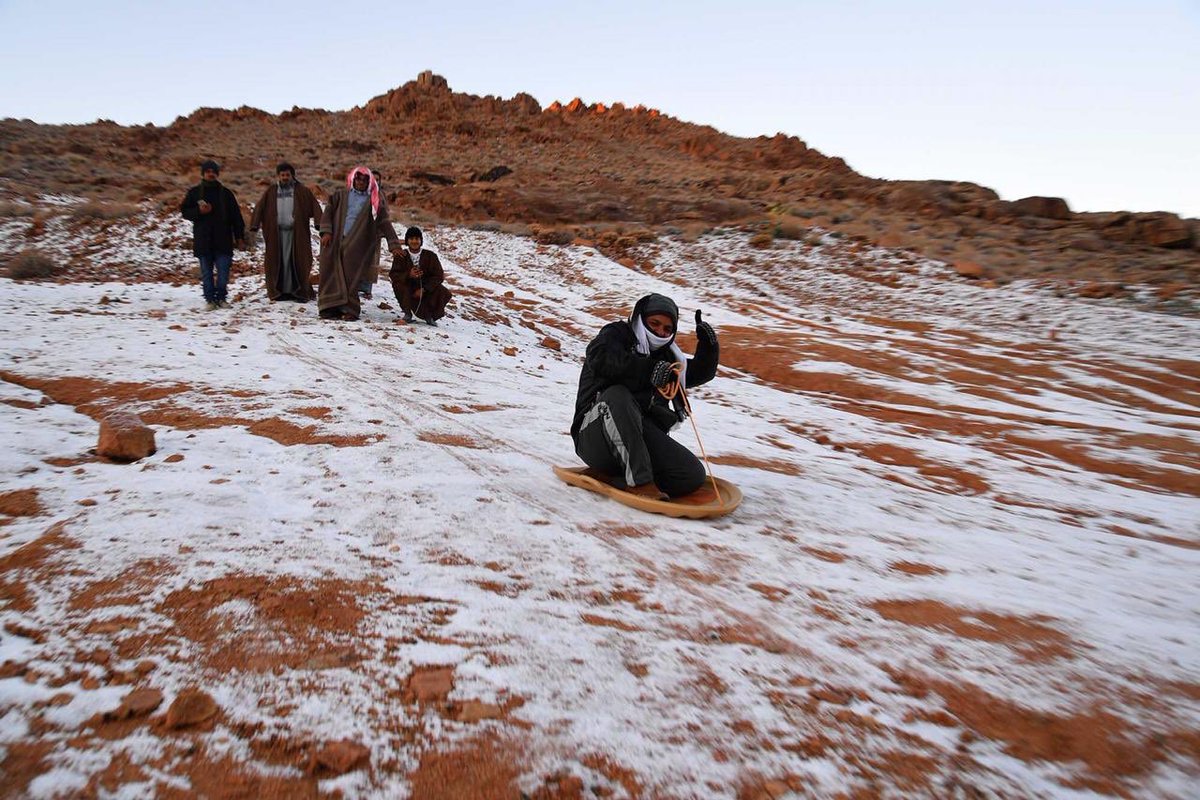 В горном районе Джебель-эль-Лауз на севере Саудовской Аравии выпал снег. Местные жители уже оборудовали пункты сдачи в аренду санок, салазок и самодельных лыж.