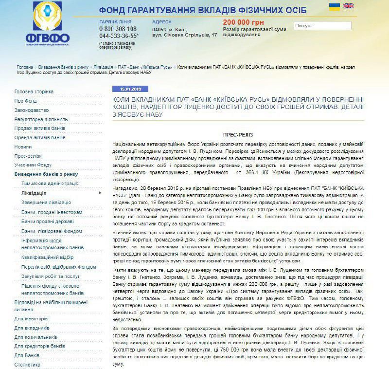 Национальным антикоррупционным бюро Украины начата проверка достоверности данных, представленных в имущественной декларации народным депутатом И. В. Луценко (уголовное производство № 52018000000001213, зарегистрированное в Едином реестре досудебных расследований 19 декабря 2018 года). Проверка осуществляется в рамках досудебного расследования НАБУ в соответствующем уголовном производстве по фактам, установленным совместно Фондом гарантирования вкладов физических лиц и правоохранительными органами, указывающими на совершение народным депутатом уголовного преступления, предусмотренного ст. 366-1 УК Украины (Декларирование недостоверной информации).