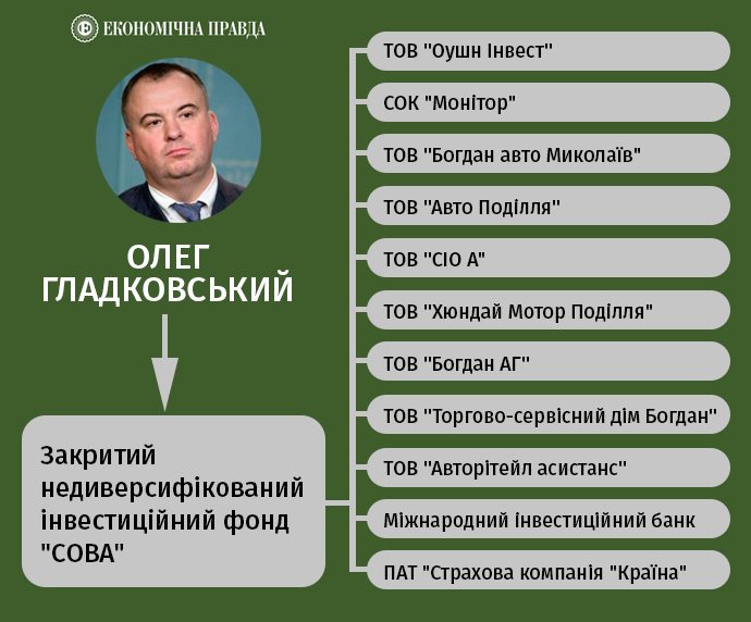 Как отмечается, Гладковский имеет закрытый недиверсифицированный инвестиционный фонд «Сова», который управляет его бизнесом. Фонд владеет акциями ряда обществ, которые занимаются продажей авто, предоставлением информационных услуг, арендой и управлением имущества.