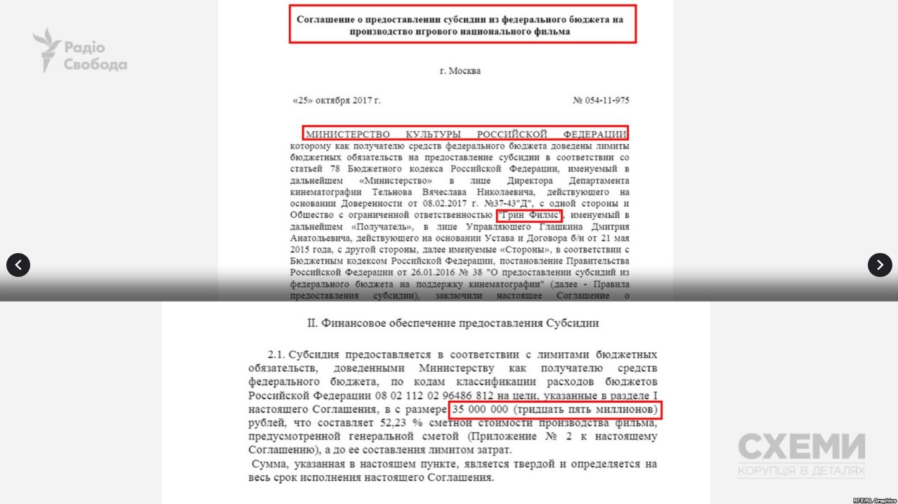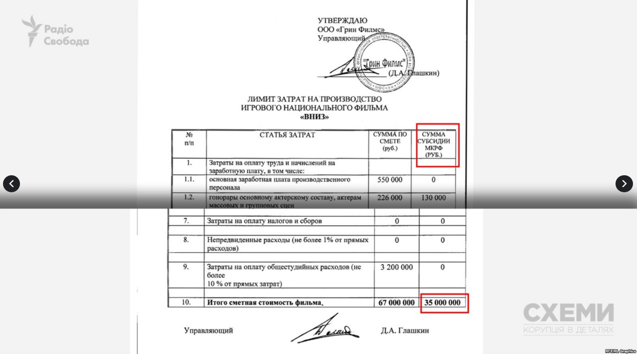 «Недавнее расследование СМИ выявило, что в 2017 году фирма Зеленского получила от Минкульта РФ (то есть — из российского бюджета) 35 млн рублей! Речь идет об одной из российских компаний Владимира „Гррин Филмс“, которой выделили указанную сумму на производство фильма „Вниз“. Одну из ролей в котором, кстати, должен был сыграть российский актер Владимир Машков, в 2018 году бывший доверенным лицом Владимира Путина на выборах президента РФ», — констатировал эксперт.