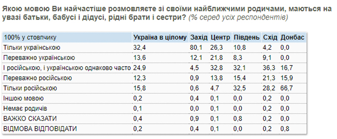 При этом 46% украинцев сообщили, что со своими ближайшими родственниками (родители, бабушки и дедушки, родные братья и сестры) говорят преимущественно или только на украинском языке (в т.ч. 32,4% говорят только на украинском языке).