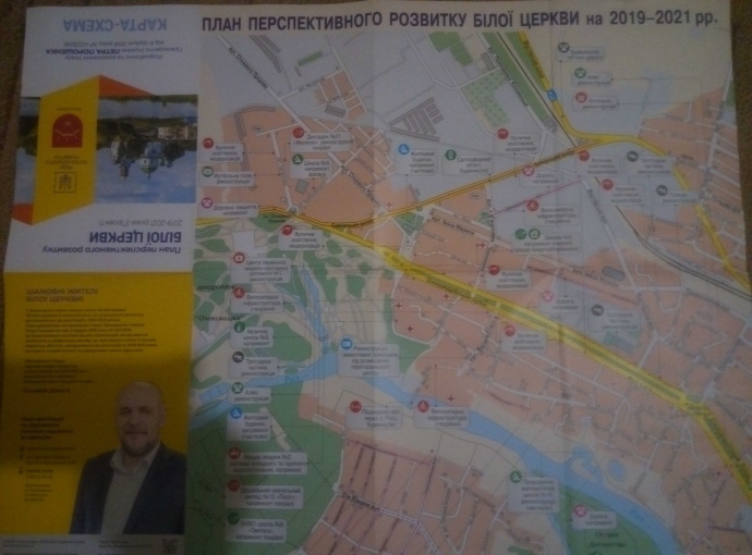 «В Белой Церкви (Киевская обл.) в жилых домах распространяют карты города с «перспективным планом развития». На карте обозначены объекты, которые будут финансироваться в 2019-2021 гг., и размещены фото мэра города Геннадия Дикого и кандидата в президенты Петра Порошенко. На конвертах, в которых распространяются материалы, есть подписи «Совет Регионального Развития» и «Президент Украины Петр Порошенко», — отмечают эксперты.