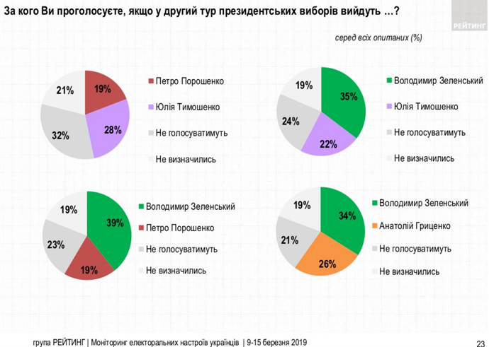 Владимир Зеленский во втором туре побеждает всех своих оппонентов. В паре с Порошенко (39% против 19%), с Тимошенко (35% против 22%) и с Анатолием Гриценко (34% против 26%).