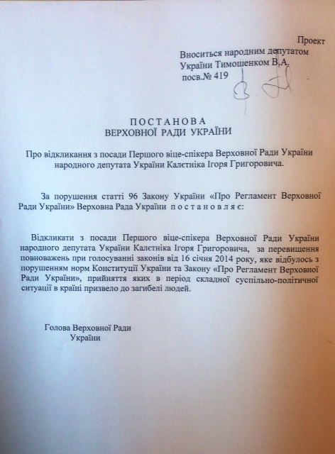 Депутаты Верховной Рады инициируют увольнение первого заместителя председателя Верховной Рады Игоря Калетника. Об этом журналистам заявил внефракционный нардеп Виктор Тимошенко, зарегистрировавший соответствующий проект.