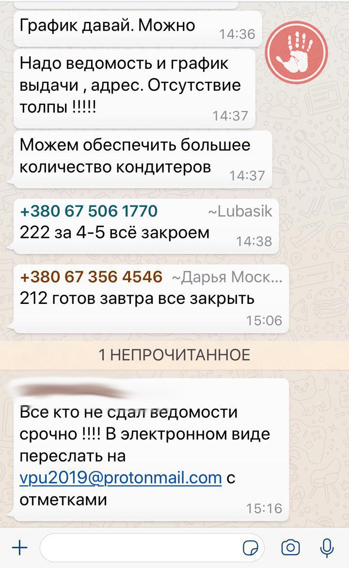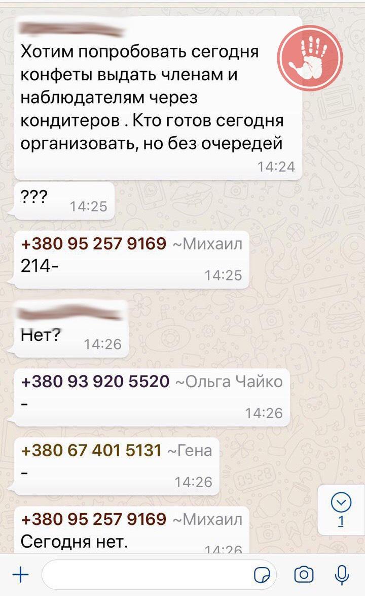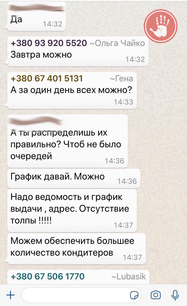 В распоряжении "Стоп политической коррупции" также оказалась переписка членов штаба Петра Порошенко. В ней шла речь о выплате компенсации наблюдателям на прошедших выборах президента. При этом, деньги в переписке называют «конфетами», а кассиров штабов «кондитерами». Отдельно, кураторы Порошенко подчеркивают необходимость раздать деньги тихо, без очередей и не собирать толпу.
