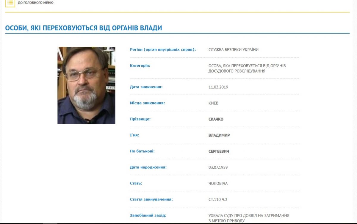 Cлужба безопасности Украины объявила в розыск журналиста Владимира Скачко по подозрению в сепаратизме. Об этом говорится в перечне разыскиваемых лиц на сайте Министерства внутренних дел, передают Українськi Новини.
