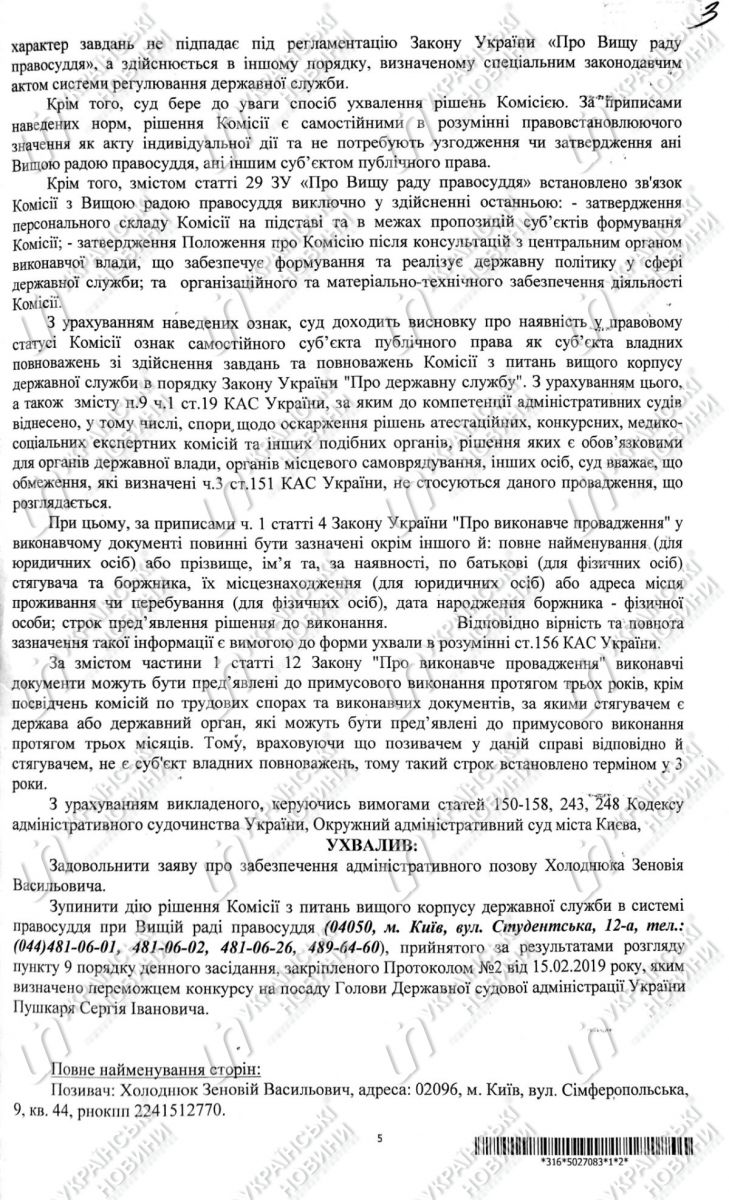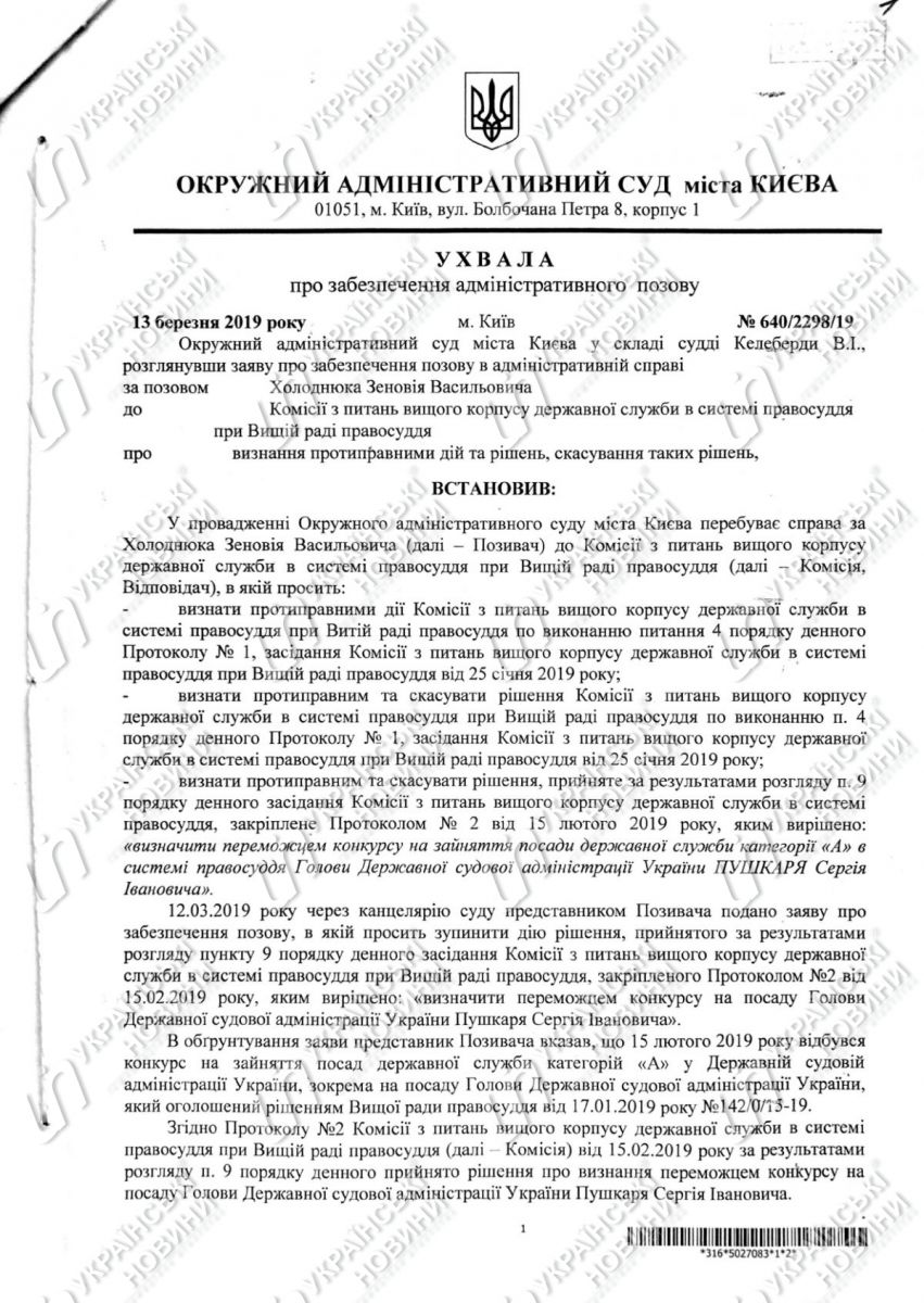 «Я обжаловал решение ВСП в Верховном Суде как суде первой инстанции. Также обратился в Окружной административный суд города Киева с иском об отмене решения конкурсной комиссии. Кстати, окружной административный суд города Киева приостановил действие решения конкурсной комиссии, которым Пушкаря определено победителем», — рассказал Холоднюк.