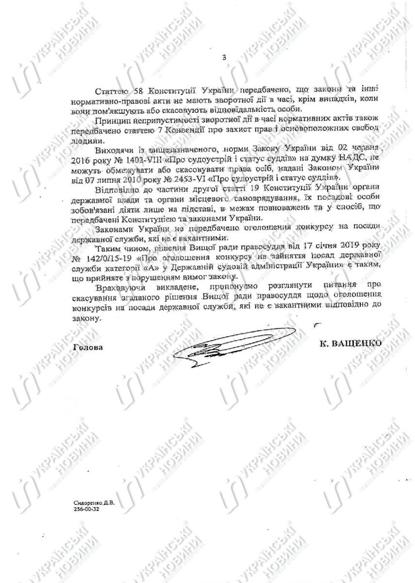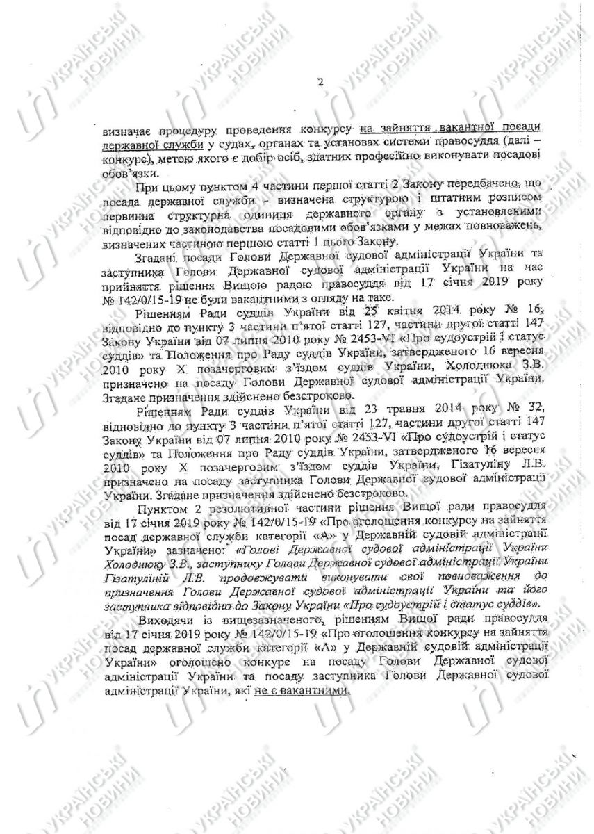 «Ситуация в следующем: 17 января 2019 Высший Совет Правосудия впервые в истории Украины, вопреки Закону Украины „О государственной службе Украины“, объявил конкурс на должность председателя ГСА и его заместителя в должности, которые, по состоянию на то время и по сегодняшний день, законно занимают действующие председатель ГСА Украины и его заместитель Людмила Гизатулина», — объясняет Холоднюк.