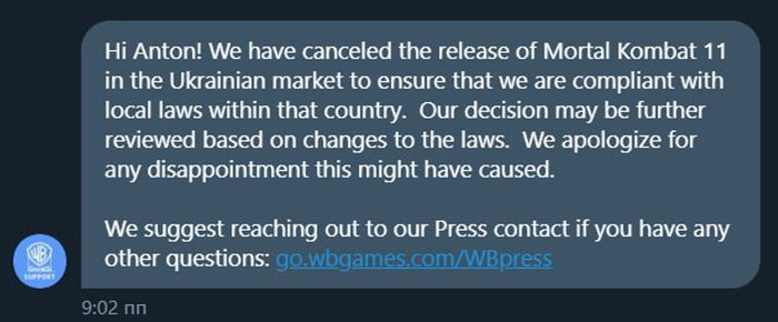 Warner Bros. отмечает, что Mortal Kombat 11 еще может выйти в Украине, но лишь после того, как что-то изменится в законодательстве. Все украинские игроки, успевшие оформить предзаказ Mortal Kombat 11, получат свои деньги назад.