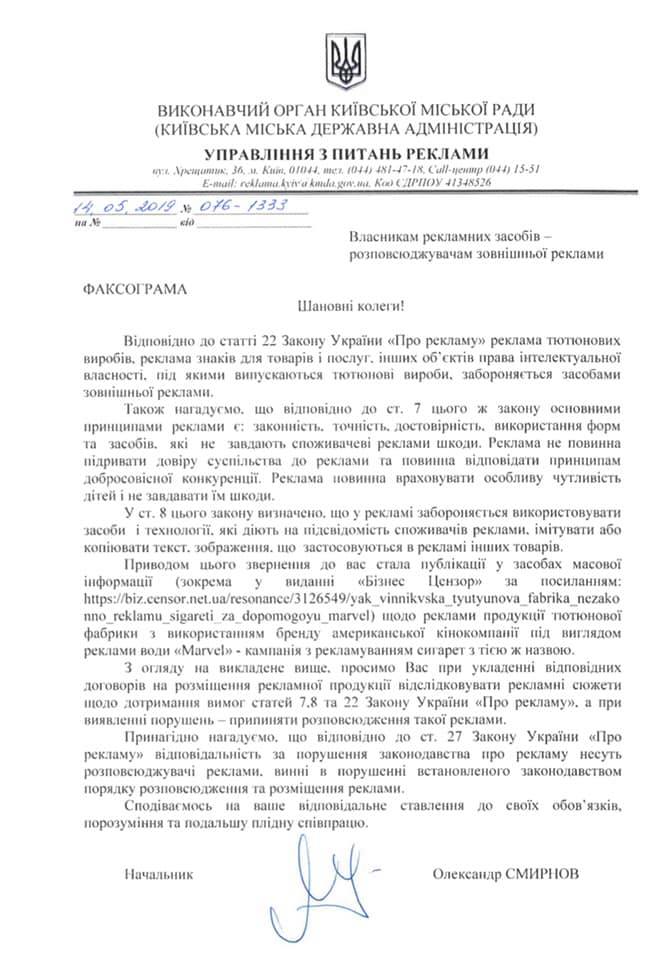 А начальник управления по вопросам рекламы КМДА Александр Смирнов разослал факсограмму распространителям внешней рекламы, напоминающую о содержании статей закона «О рекламе», которые были нарушены при размещении рекламы табачного бренда. «Просим вас при составлении договоров на размещение рекламной продукции отслеживать рекламные сюжеты на соответствие требованиям статей 7, 8 и 22 закона „О рекламе“, а при выявлении нарушений прекращать распространение такой рекламы,» — говорится в факсограмме.