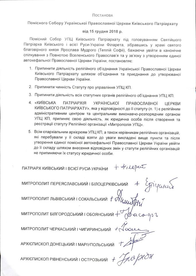 «Прекратить деятельность религиозного объединения Украинской Православной Церкви Киевского Патриархата путем объединения и присоединения к создаваемой Православной Церкви Украины».