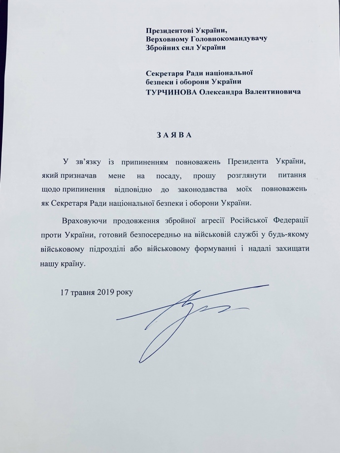 «В связи с прекращением полномочий президента Украины, который назначил меня на должность, прошу рассмотреть в соответствии с законодательством вопрос прекращения моих полномочий как секретаря Совета национальной безопасности и обороны Украины», — говорится в заявлении.