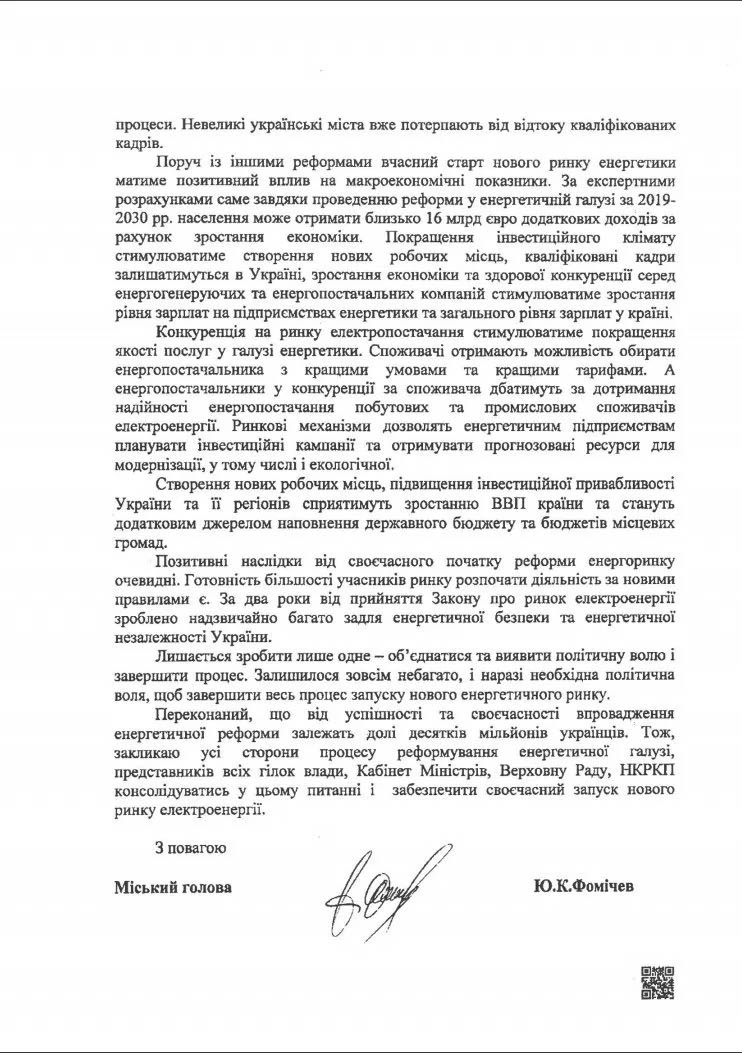 Об этом Фомичев сообщил в своем письме на имя вице-премьер-министра Владимира Кистиона, председателя профильного комитета по вопросам топливно-энергетического комплекса (ТЭК) Верховной Рады Украины Александра Домбровского и председателя Национальной комиссии, осуществляющей государственное регулирование в сферах энергетики и коммунальных услуг (НКРЭКУ) Оксаны Кривенко.