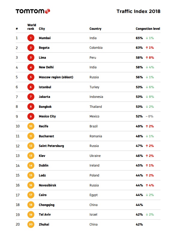 Наиболее загруженным городом в мире признали Мумбаи в Индии с показателем 65%. В первую пятерку также вошли Богота (Колумбия, 63%), Лима (Перу, 58%), Нью-Дели (Индия, 58%) и Московская область (Россия, 56%).