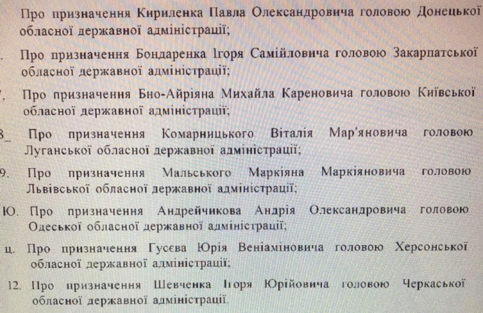 Вице-премьер-министр Павел Розенко опубликовал список кандидатов, которых в Администрации президента Владимира Зеленского предлагают на должности председателей областных государственных администраций.