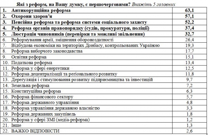 Граждане Украины считают приоритетными реформами антикоррупционную, пенсионную, реформу охраны здоровья, органов правопорядка и люстрацию чиновников.