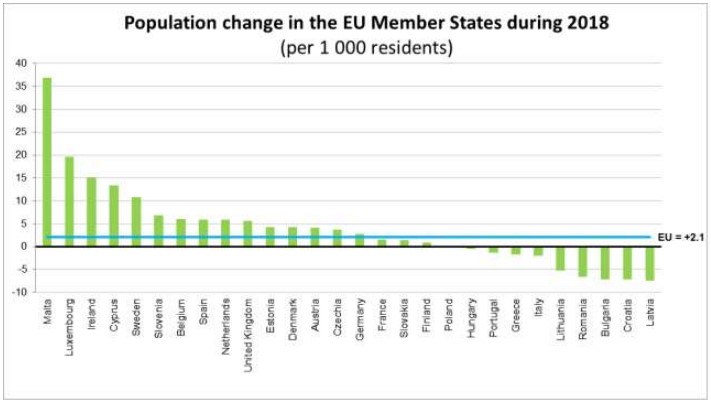 Среди пятнадцати членов ЕС, где зарегистрировали негативные изменения в прошлом году, были Болгарии (-6.6 ‰), Латвия (-4.9 ‰), Литва (-4.1 ‰), Хорватия, Венгрия и Румыния (все −3.9 ‰).