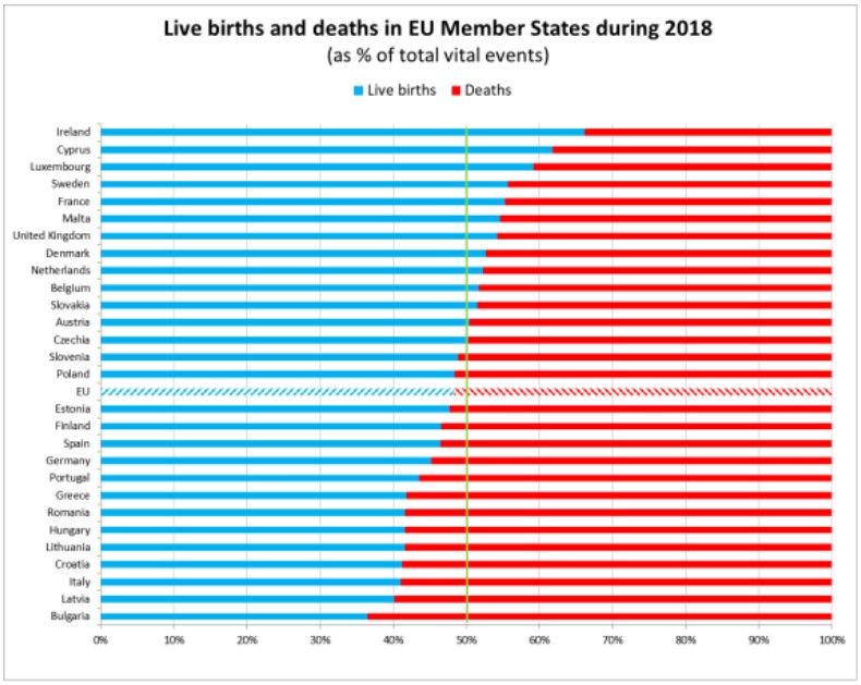 По ЕС уровень рождаемости составлял 9,7 на 1000 жителей. В то же время в 2018 году в ЕС было зарегистрировано 5,3 млн смертей, что почти на 46 тыс. больше, чем годом ранее.