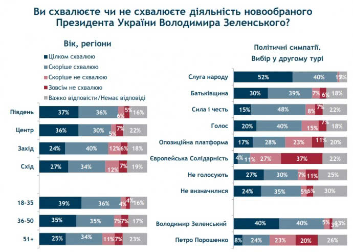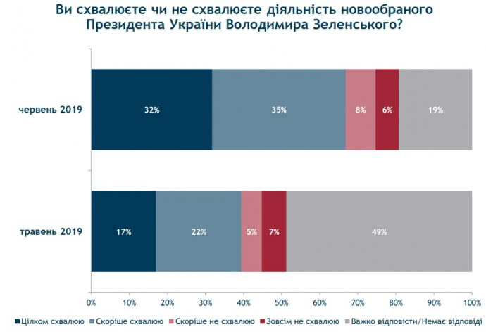 В мае, вернее по результатам работы Зеленского в течение 11 дней после инаугурации 20 мая, «вполне одобряли» его действия 17% опрошенных, «скорее одобряли» 22%. За месяц показатель «однозначной» поддержки президента вырос до 32%, а тех, кто «скорее одобряют» — до 35%. Такие данные предоставила социологическая группа «Рейтинг».