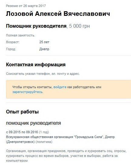 По данным украинского интернета, человек с именем Лозовой Алексей Вячеславович еще в 2017 году разместил резюме на одном из сайтов, специализирующемся на поиске работы. Как указано в резюме, работал он в общественной организации «Громадська Сила», Днепр.