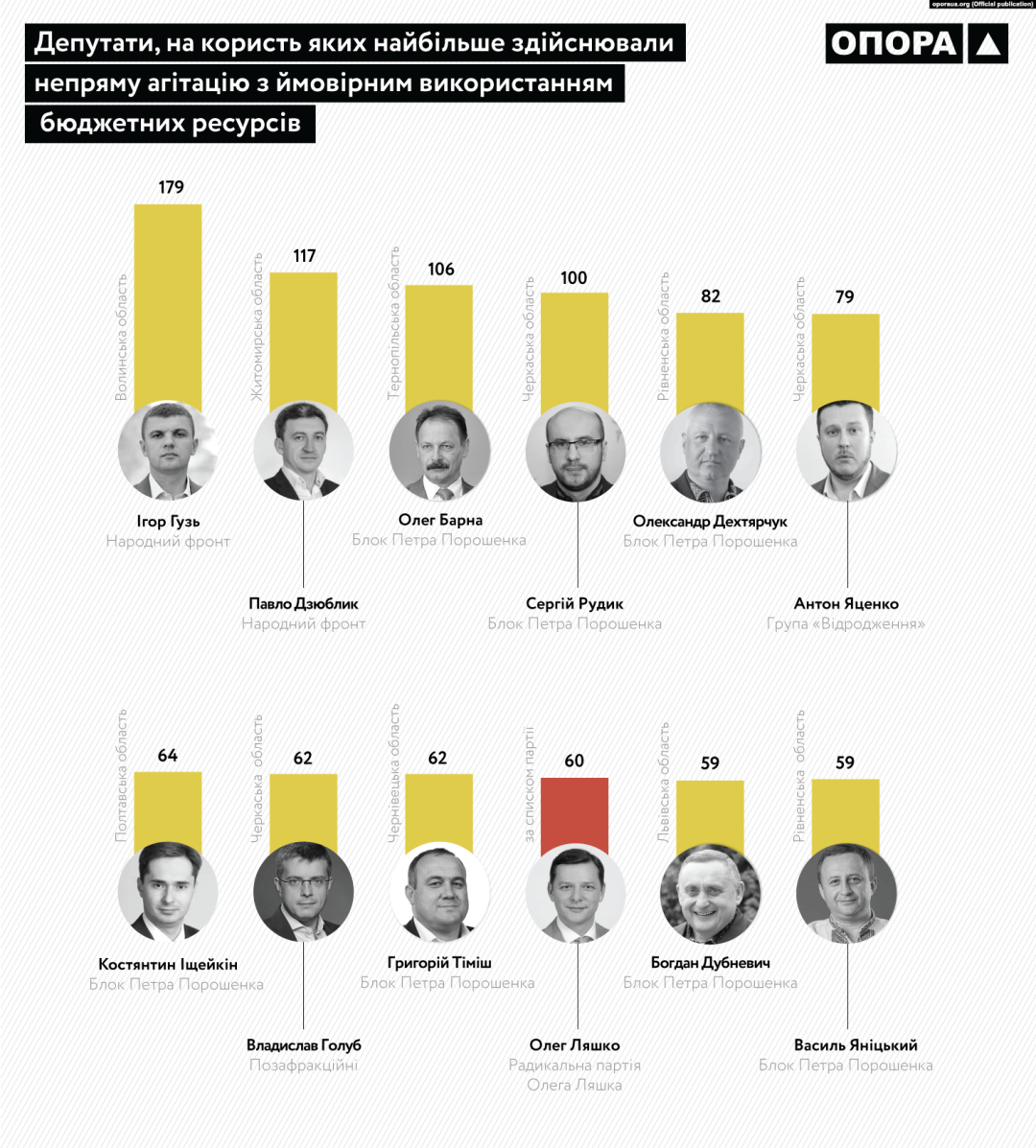 «Что касается остальных 30 парламентариев, то наблюдатели ОПОРЫ зафиксировали с их стороны от 1 до 54 случаев использования субвенций в агитации. В частности, больше всего их зафиксировано со стороны Михаила Бондаря (баллотировался по 118 избирательному округу от „Европейской солидарности“, что во Львовской области), Олеся Довгого (самовыдвиженец, округ № 102 на Кировоградщине), Ярослава Дубневича (округ № 120 на Львовщине), Николая Кучера (самовыдвиженец, округ № 17 на Винниччине) и Тараса Батенко, победившего в 123 избирательном округе на Львовщине», — отмечают в ОПОРЕ.
