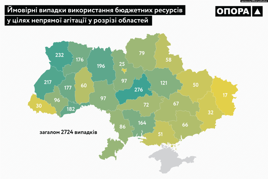 В период с июня 2018 года по июль 2019 года наблюдатели Гражданской сети «ОПОРА» зафиксировали 2 724 случая пиара на бюджетных ресурсах со стороны 147 депутатов, которые были избраны по мажоритарным округам и 27 — по партийным спискам.