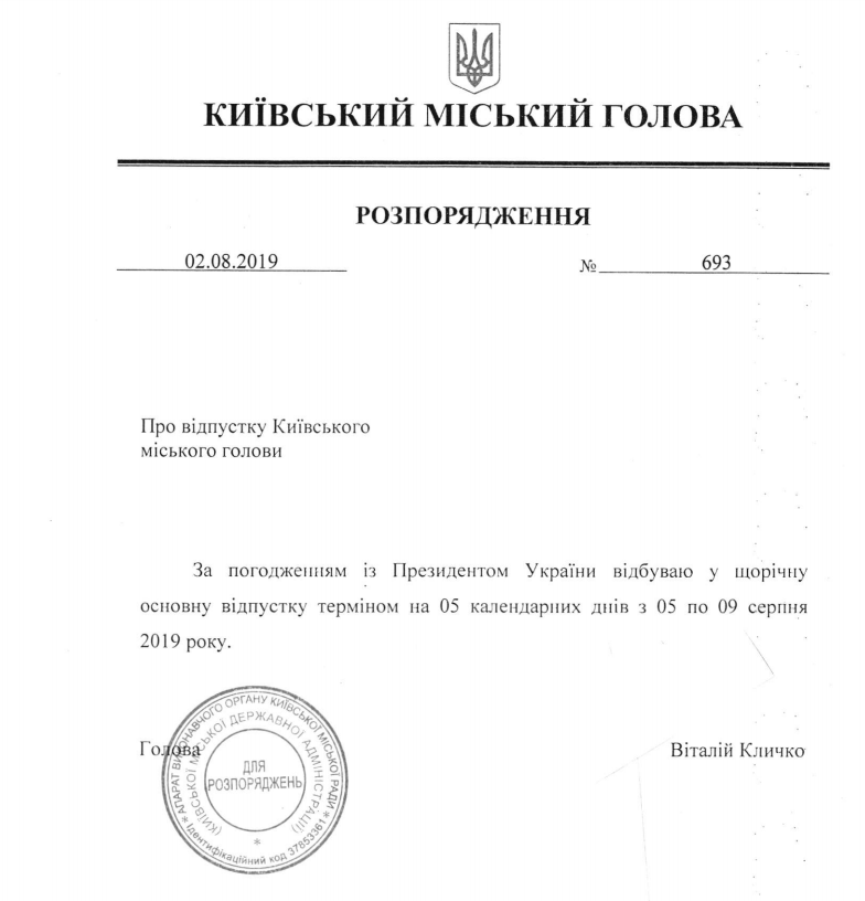 Согласно заявлению мэра, опубликованному на сайте Кievvlast, он ушел в согласованный с президентом непродолжительный отпуск с 5 по 9 августа.