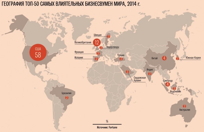 Стоит отметить, что представительницы США оккупировали более половины (58 %) глобального списка. Кроме американок, эксперты Fortune включили в рейтинг женщин-руководителей еще из 14 стран мира. Лучшей из них стала занявшая 4-е место бразильянка Мария дас Гракас Фостер, которая возглавляет государственную энергетическую корпорацию Petrobras. А наибольшее количество строчек глобального списка после бизнес-леди из США заняли представительницы Великобритании (12 %).