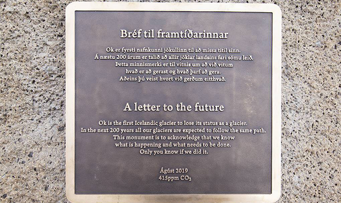 «Окйекудль — первый исландский ледник, который потерял свой статус. Такая же судьба постигнет все остальные ледники в ближайшие 200 лет. Эта доска здесь — напоминание о том, что происходит и что необходимо сделать. Только вы знаете, удалось нам или нет», — написано на доске. Посвящение, написанное исландским автором Андри Снаером Магнасоно, заканчивается датой церемонии и концентрацией углекислого газа в воздухе во всем мире — 415 частей на миллион.