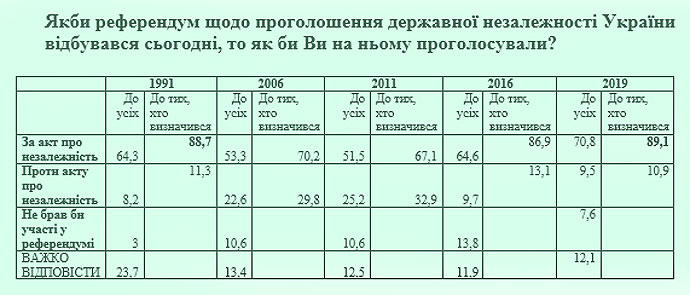 Если бы референдум о провозглашении независимости состоялся в августе 2019 года, то 89% его участников поддержали бы независимость. Об этом свидетельствуют результаты опроса Фонда «Демократические инициативы» имени Илька Кучерива и Киевского международного института социологии, проведенного с 8 по 20 августа.