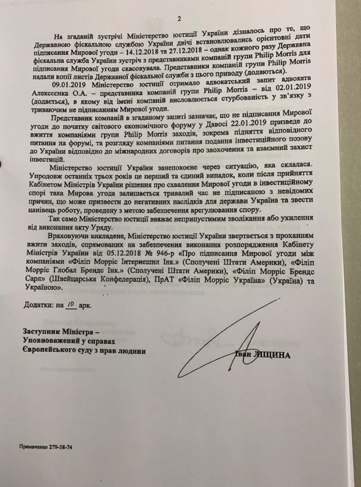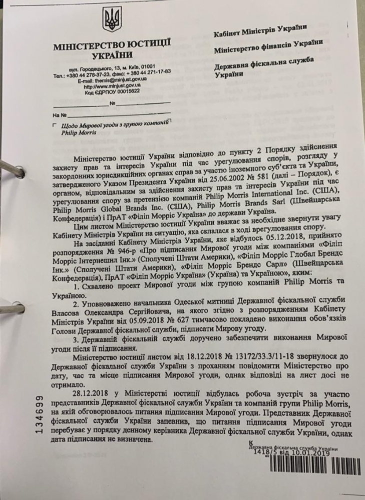 Июнь 2019 года возбуждение ДБР уголовного производства № 62019170000000505 о законности заключения мирового соглашения в рамках урегулирования международного инвестиционного спора между Украиной и «Philip Morris Ukraine».