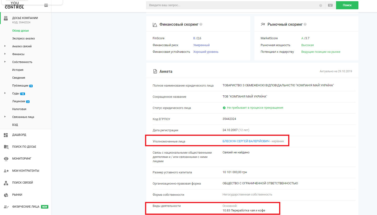 В течение 2018 — 2019 годов ООО «Компания Май Украина» провела до 3 операций с оффшорами из «Черного списка» ЕС. Об этом свидетельствуют данные аналитического портала YouControl.
