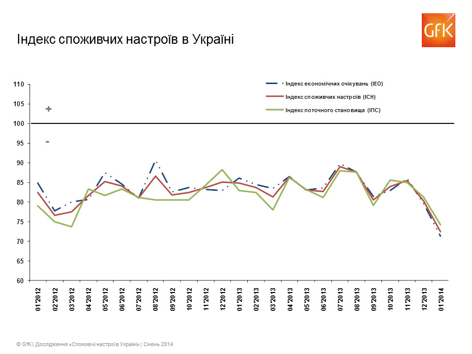 Индекс потребительских настроений украинцев в январе 2014 г. упал на 7,8 пункта до минимального уровня с апреля 2011 г. — 72,5 пункта, хотя еще в декабре он превышал 80 пунктов. Об этом свидетельствует исследование, которое ежемесячно проводит компания GfK Ukraine.