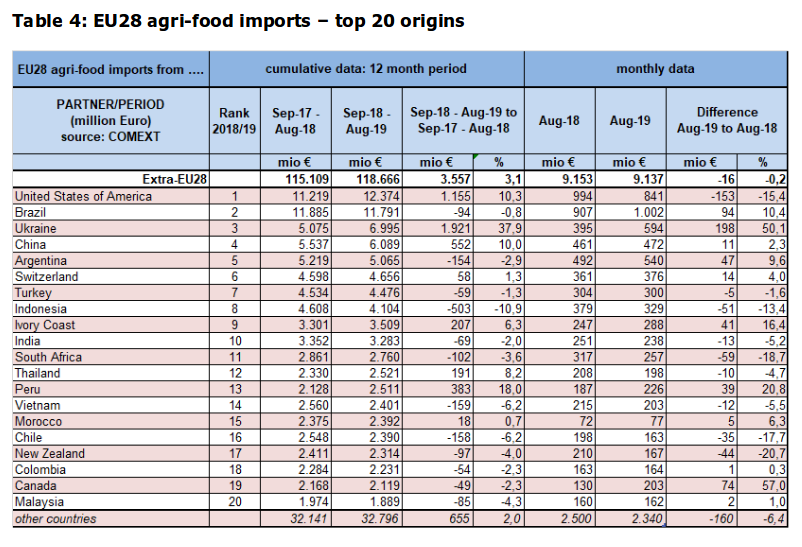 Вышеприведенная статистика касается периода 12 месяцев — с сентября 2018 года по август 2019 года; за этот период общий объем импорта агропромышленной продукции в страны ЕС вырос на 3 процента к аналогичному предыдущему периоду 2017-2018 годов и составил 118,6 миллиарда евро.
