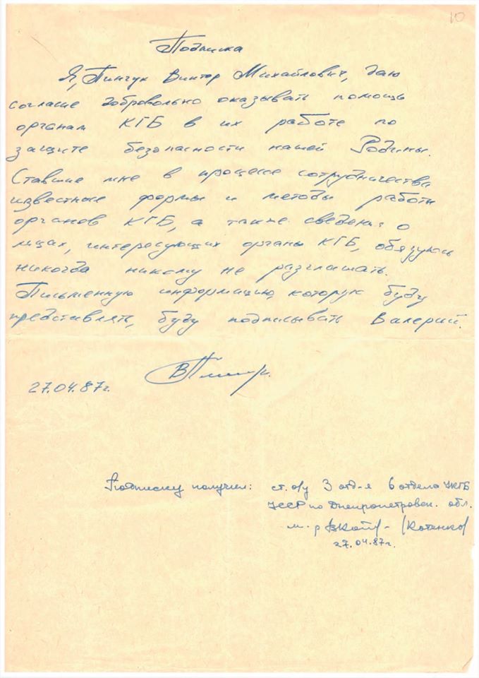 Согласно подписке, агентурный псевдоним Пинчука является «ВАЛЕРИЙ».