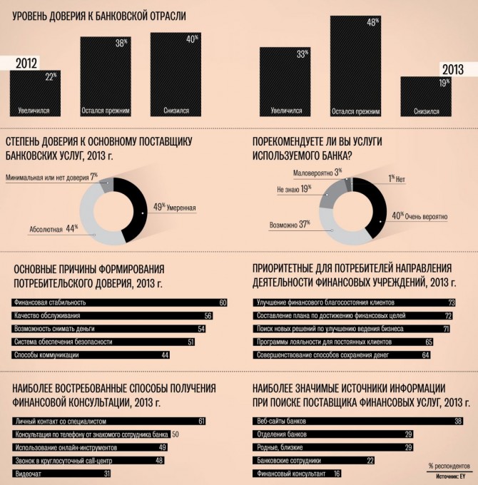 За последний год доля потребителей финансовых услуг, укрепивших свое доверие к банковской отрасли, увеличилась на 11 % и теперь составляет 33 %. В то же время число тех, кто стал меньше доверять финансовым учреждениям, наоборот, сократилось в два раза (19 % в 2013 г. против 40 % в 2012 г.).