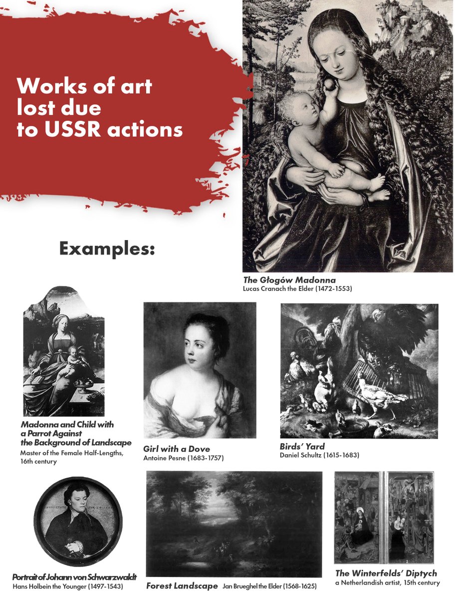 Вместе с текстом опубликована инфографика под названием «Потери культурных ценностей в результате деятельности СССР». Представленные примеры включают такие картины, как «Мадонна Глоговская» Лукаса Кранаха Старшего, «Девочка с голубем» Антуана Пэна, «Птичий двор» Даниэля Шульца и «Лесной пейзаж» Яна Брейгеля Старшего.