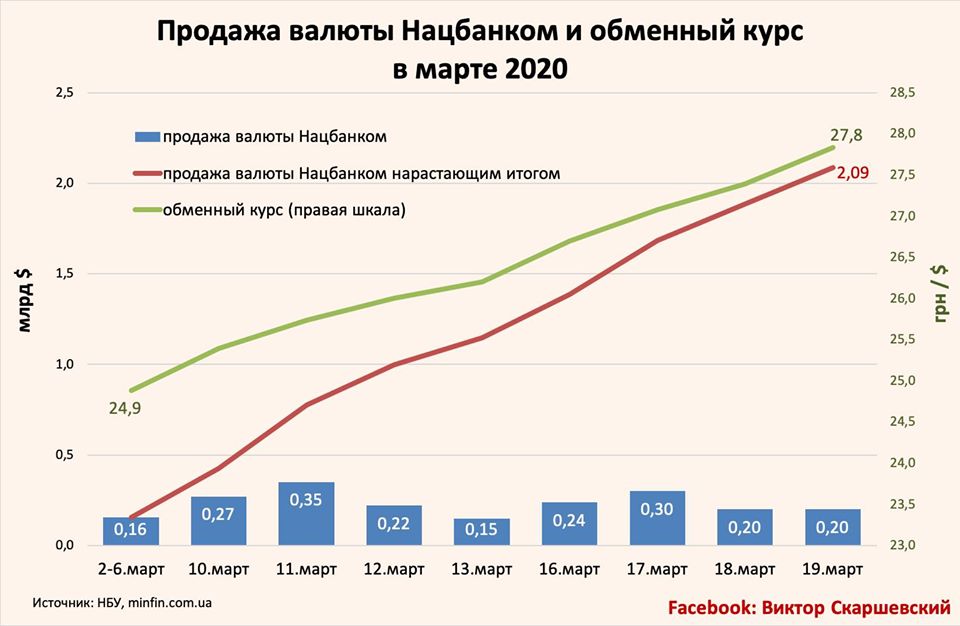 Несмотря на щедрую поддержку Нацбанка в виде продажи валюты из золотовалютных резервов, доллар с начала марта подорожал на 3,9 грн/$ (+12%) и достиг на межбанковском рынке 27,8 грн/$.