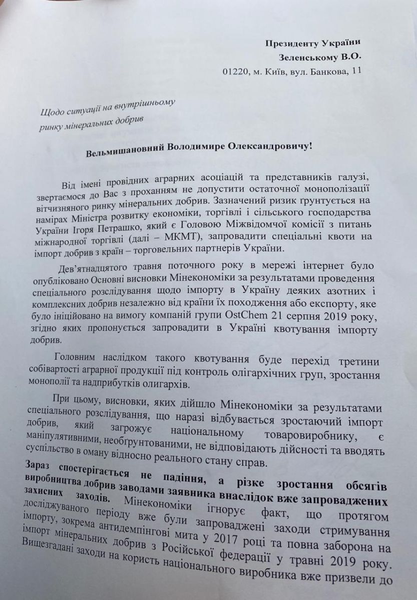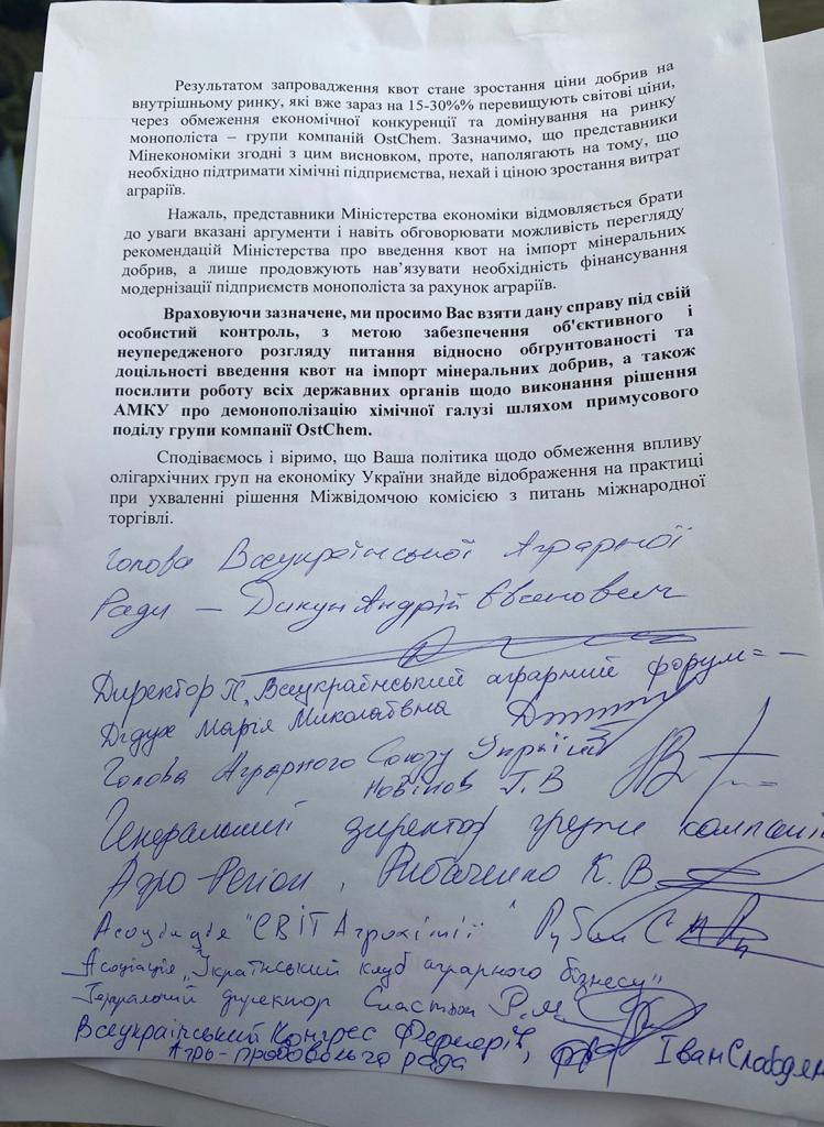 В обращении аграрии призвали Владимира Зеленского взять под личный контроль, а также усилить работу всех государственных органов по выполнению решения АМКУ о демонополизации химической отрасли путем принудительного разделения группы компаний Ostchem Дмитрия Фирташа.