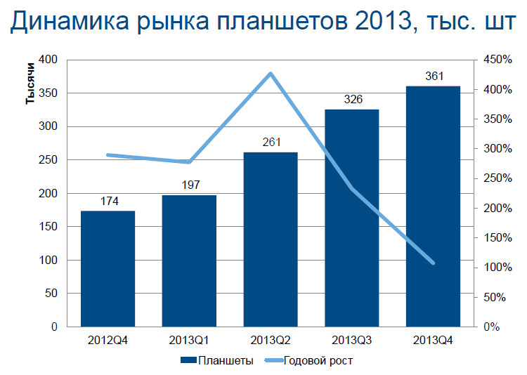 По оценкам аналитиков IDC, отечественный рынок планшетов остается третьим по величине в странах Центральной и Восточной Европы, уступая только России (8,6 млн устройств в 2013 г.) и Польше (2 млн). А по темпам роста украинский рынок, как и в 2012 г., располагается на второй строчке в регионе вслед за Румынией (216%).
