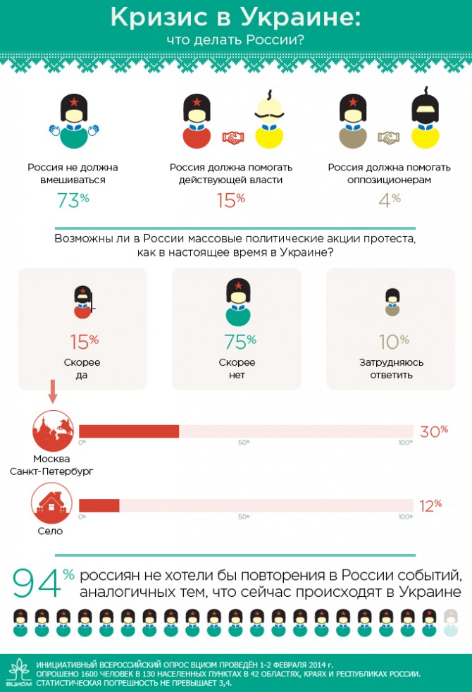 Инициативный всероссийский опрос ВЦИОМ проведён 1-2 февраля 2014 г. Опрошено 1600 человек в 130 населенных пунктах в 42 областях, краях и республиках России. Статистическая погрешность не превышает 3,4%.