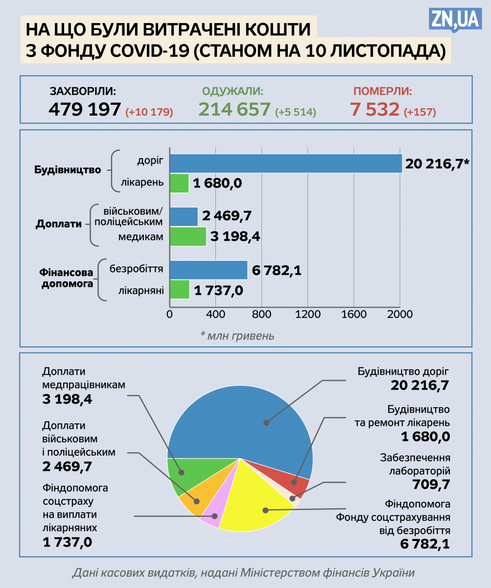 На ремонт больниц было потрачено 1 680,0 млн гривен (цифра не изменилась, по сравнению с прошлым отчетным периодом), тогда как на восстановление дорог с того же «коронавирусного» фонда потратили уже 20 216,7 млн грн.