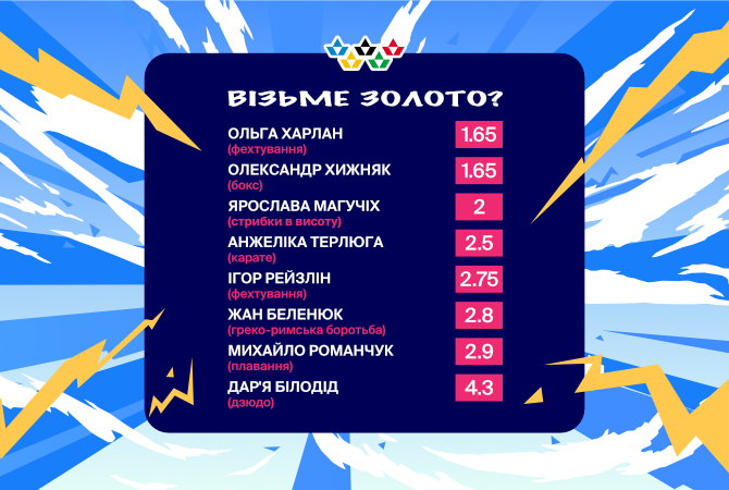 Отметим еще шпажиста Игоря Рейзлина, каратистку Анжелику Тергюгу (карате наконец-то дебютирует на Олимпиаде!), опытнейшую Елену Костевич, бравшую золото в стрельбе из пистолета в далеком 2004 году и, конечно, дзюдоистку Дарью Билодид. FAVBET считает, что Дарья принесет Украине первую медаль Олимпиады уже в эту субботу.