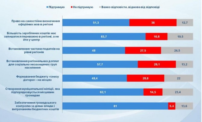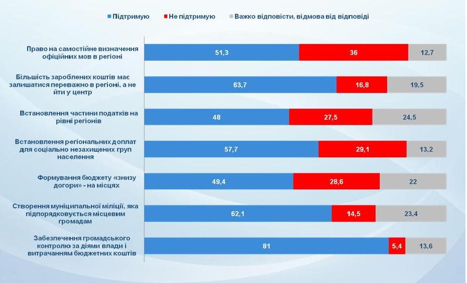 Полученные в ходе опроса результаты демонстрируют наличие широкого общественного запроса на расширение прав регионов и территориальных общин», - отметил директор Центра исследований проблем гражданского общества Виталий Кулик.