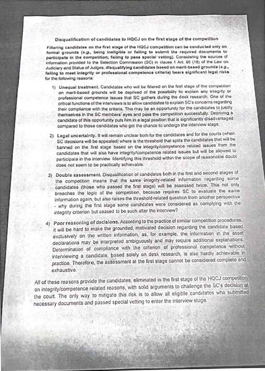 «Отбор кандидатов на первом этапе конкурса ВККС может проводиться только по формальным основаниям.... дисквалификация кандидатов на основании заслуг (например, несоответствие критериям добросовестности или профессиональной компетентности) несет значительные правовые риски..», — отмечается в документе, который, по видимому, составлен сотрудниками Chemonics или неким американским органом.