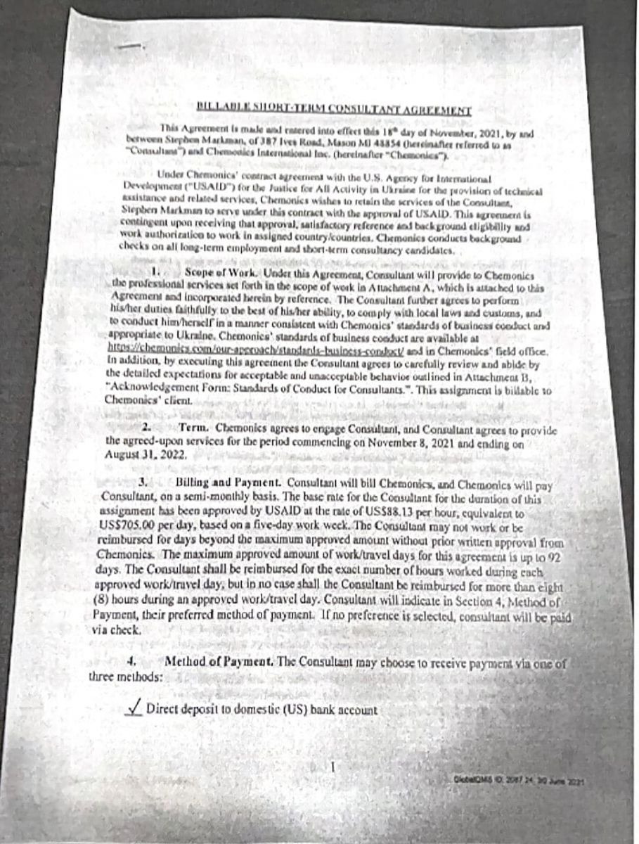 В нем отмечается, что Маркман (именуемый далее в тексте «Консультант») будет предоставлять «услуги» не украинскому или американскому правительствам, а компании Chemonics с 8 ноября 2021 года по 21 августа 2023 года.