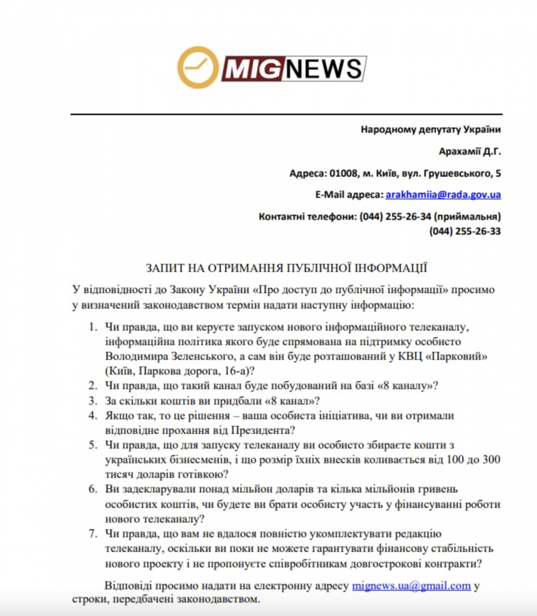 Также в документе просят Арахамию подтвердить или опровергнуть информацию о том, что для запуска телеканала нардеп лично собирает средства с украинских бизнесменов и что размер их вкладов колеблется от 100 до 300 тысяч долларов наличными.